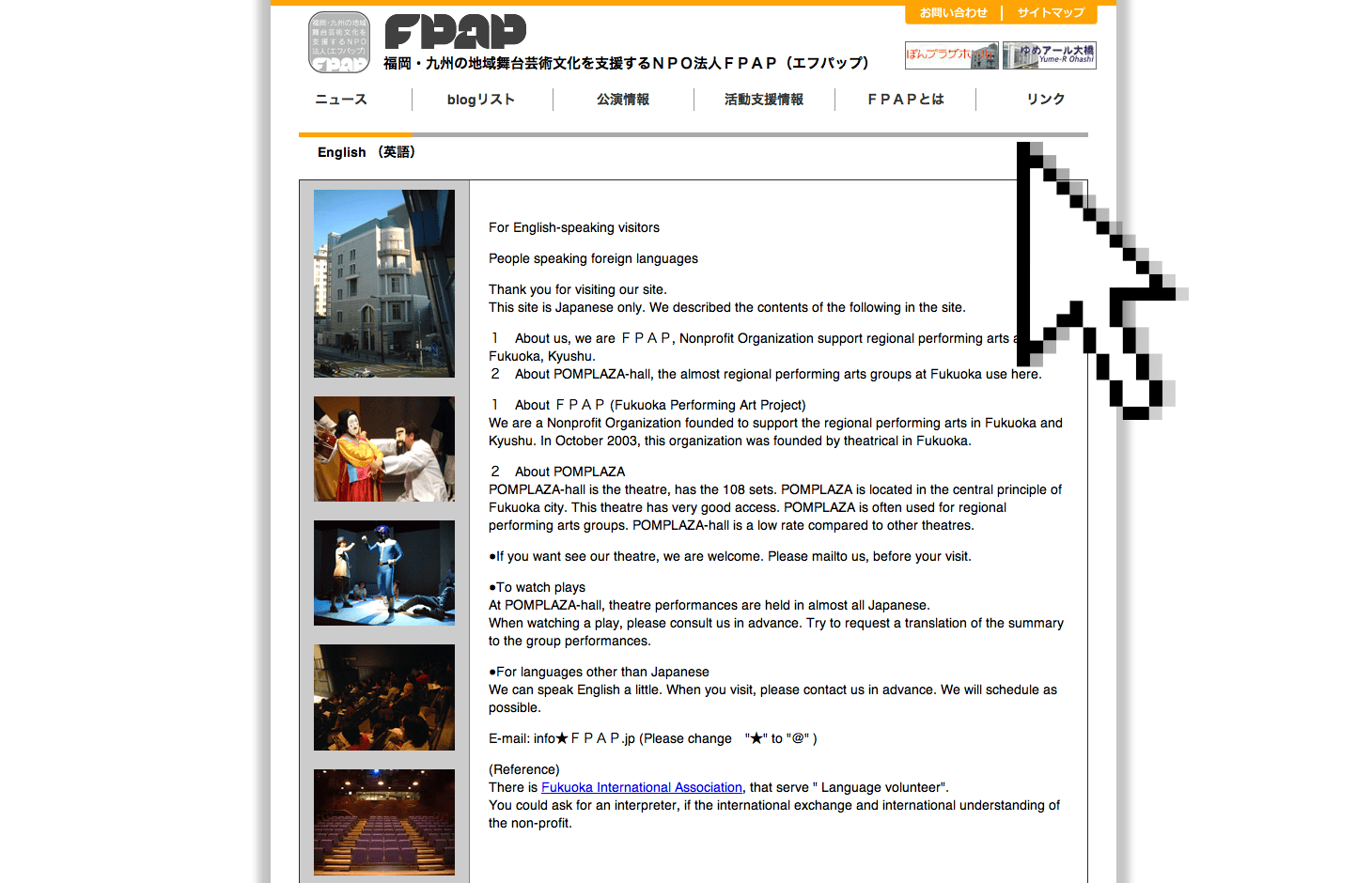 A helpful page for English speakers interested in theater. FPAP are a non-profit organization supporting regional performing arts in Fukuoka. They will be happy to supply you with information about theater, a synopsis of a performance and even an interpreter.